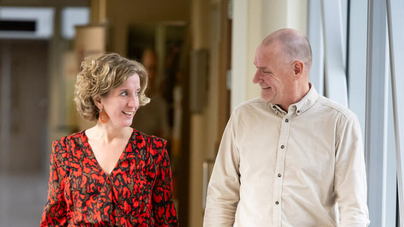 Hoofd financiën van Aventus Harold Bosgoed en Elze Bent, manager Leerhuis van Gelre Ziekenhuizen gaan met elkaar in gesprek over hoe ze als partners samenwerken en zo onder andere bijdragen aan een vitale regionale arbeidsmarkt.